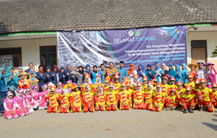 NERS NEWS - Mojokerto (11/08/2017), Menindaklanjuti Pengabdian Masyarakat mahasiswa Pendidikan Magister Peminatan Jiwa angkatan M10 Universitas Airlangga, hari ini Sabtu 11 Agustus 2018 didakan pengabdian mansyakat kedua dengan tema Sosialisasi Gerakan Masyarakat Hidup Sehat (GERMAS) di MI Miftakhul Huda Dlanggu Mojokerto Jawa Timur. Kegiatan ini diikuti oleh seluruh siswa dan guru MI Miftakhul Huda bersama mahasiwa beserta dosen Departemen Keperawatan Jiwa, Komunitas, dan Maternitas Universitas Airlangga. Acara di buka dengan penampilan marching band siswa MI Miftakhul Huda, dilanjutkan dengan pembukaan kegiatan pengabdian masyarkat oleh kepala sekolah MI dan pihak Univeritas Airlangga dalam hal ini pimpin oleh Wakil Dekan III Dr. Ah. Yusuf, S.Kp., M.Kes. Kegiatan ini diikuti oleh 170 siswa yang terbagi menjadi dua kelompok besar yaitu kelas 1,2,3 dan kelas 4,5,6. Kegiatan pengabdian masyarakat ini mendukung program Kementerian Kesehatan RI di tingkat UKS Sekolah.